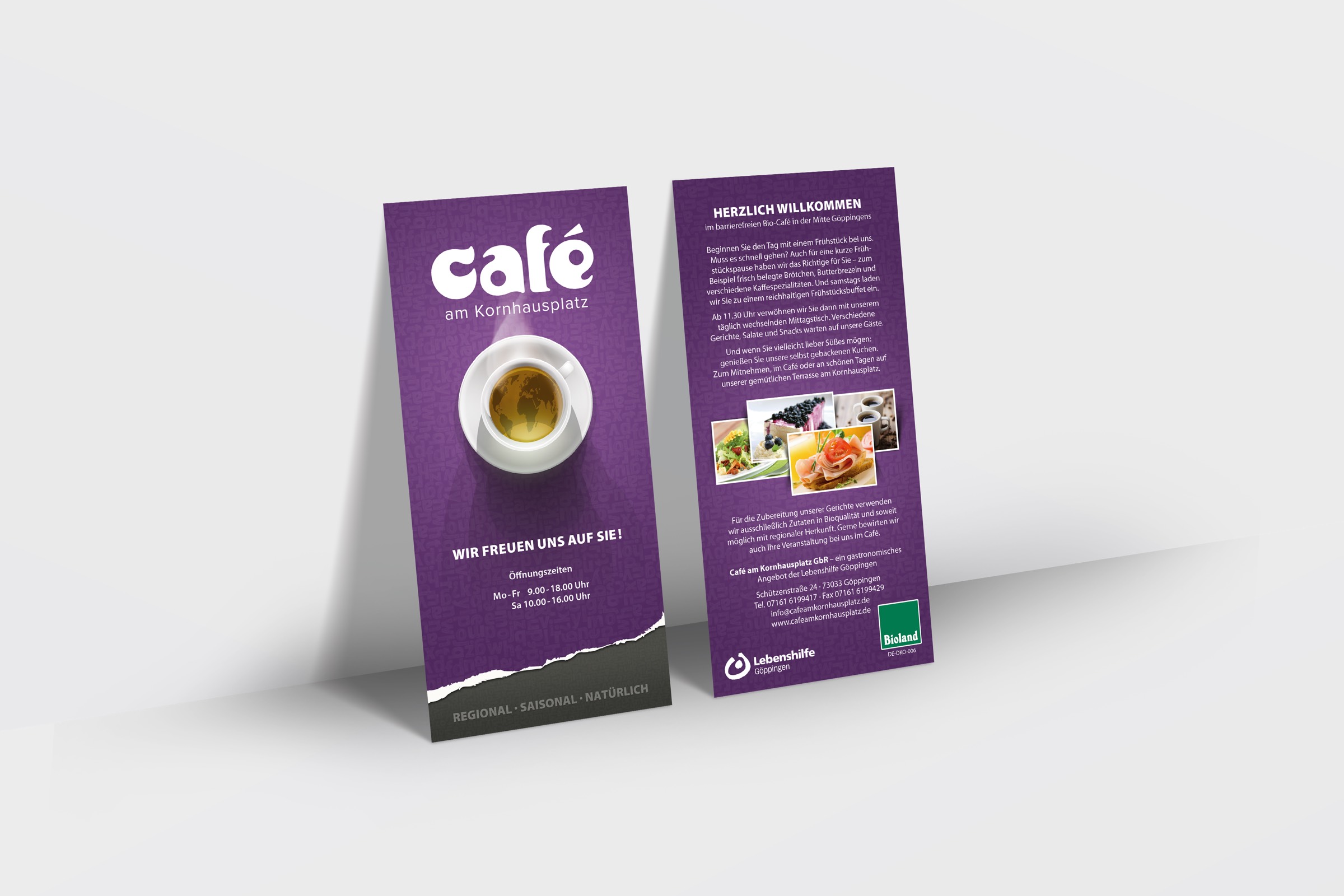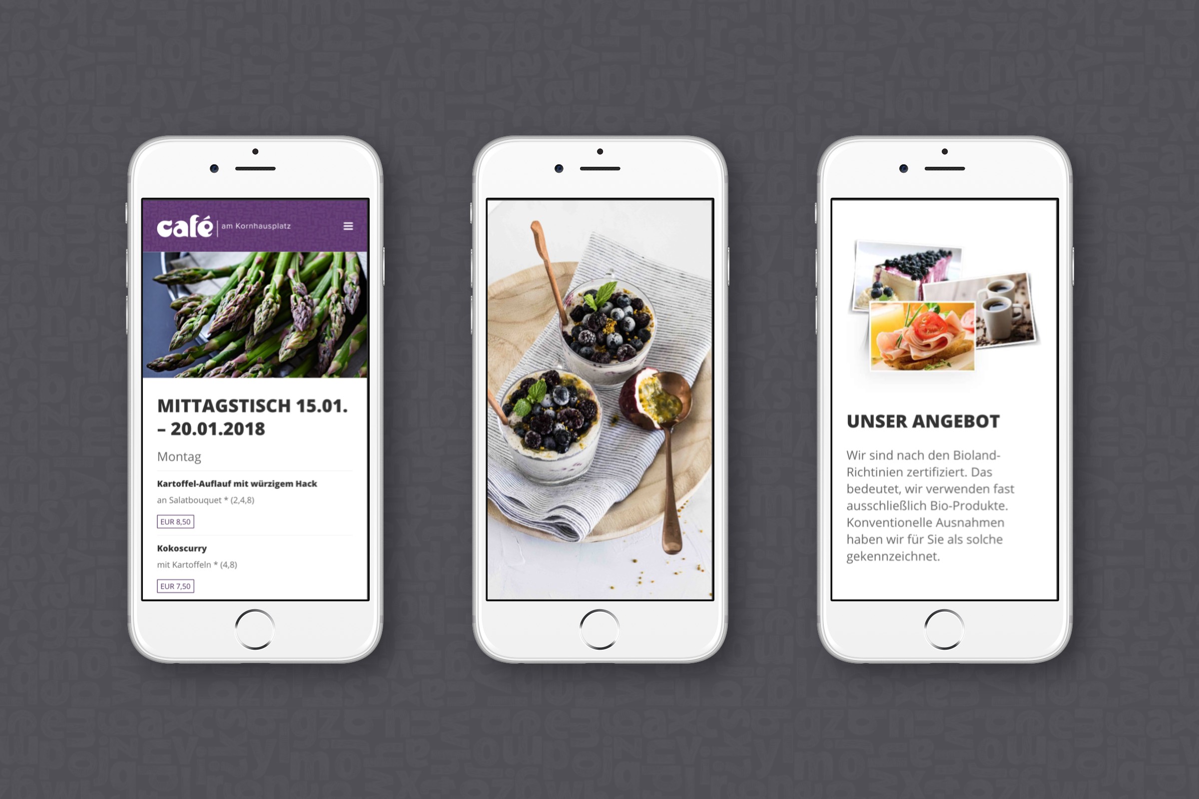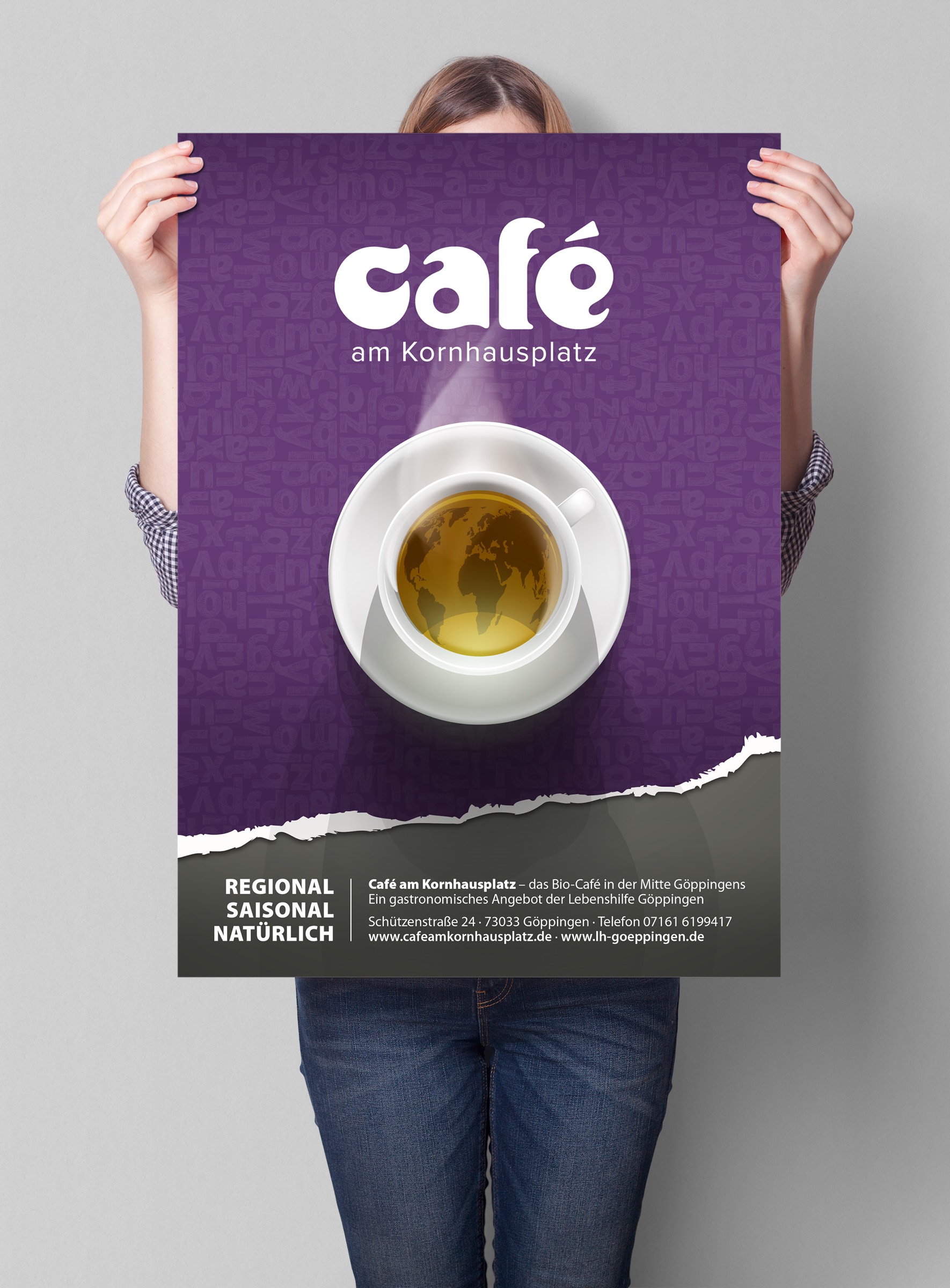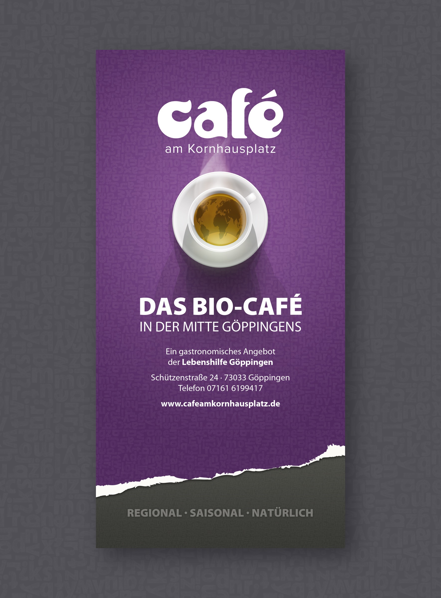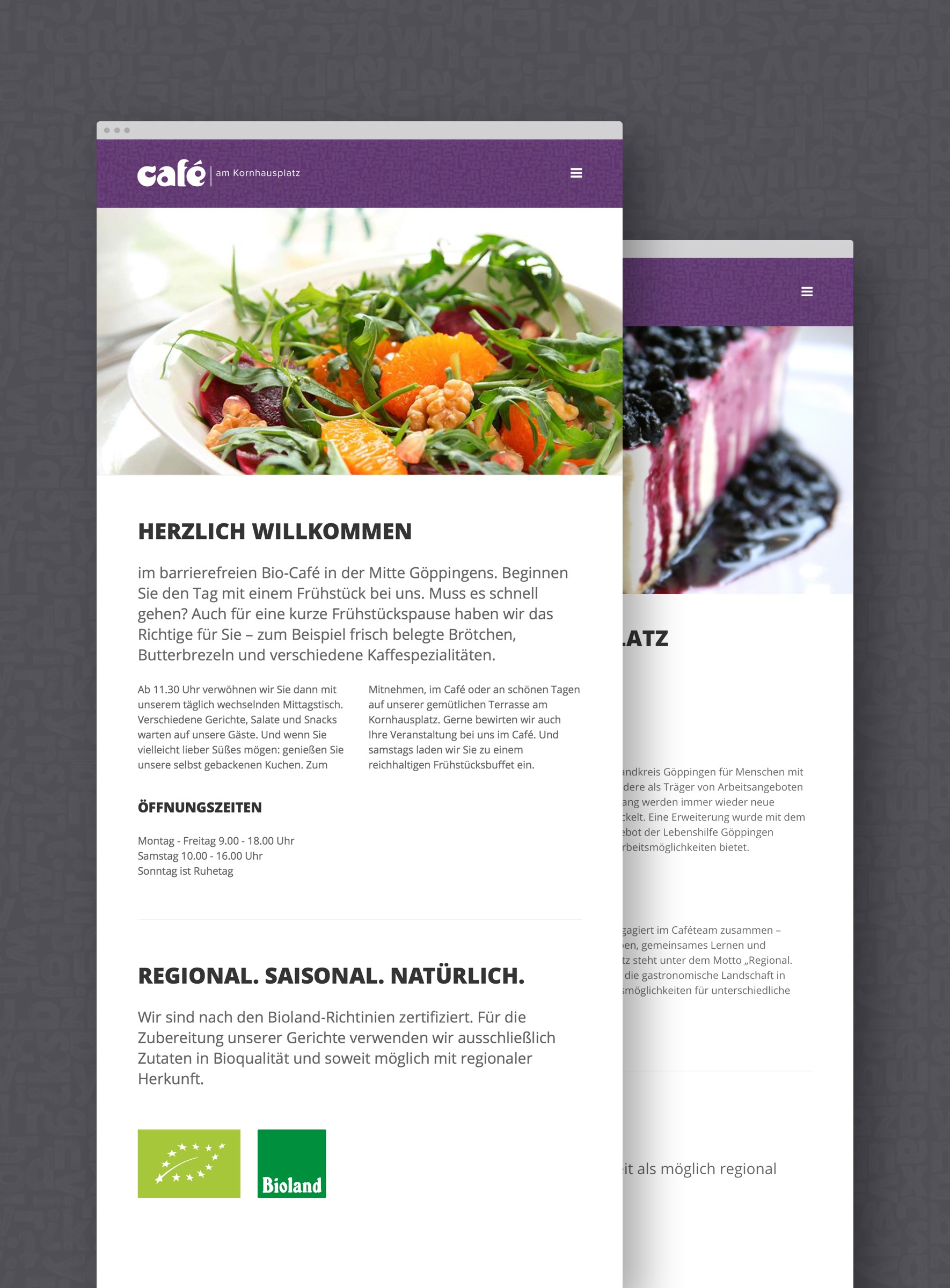 Das Café am Kornhausplatz steht ganz unter dem Motto „Regional. Saisonal. Natürlich“ und bereichert mit seinem Angebot seit 2012 die gastronomische Landschaft in Göppingen. Menschen mit und ohne Behinderungen arbeiten hier engagiert im Team zusammen. Das ermöglicht ein gegenseitiges Erleben, gemeinsames Lernen und Weiterentwickeln – sowohl den Beschäftigten als auch den Gästen. Mit viel Empathie und Herzblut schufen wir ein stimmiges Erscheinungsbild, von der Wortmarke bis hin zum Online-Auftritt des Cafés.